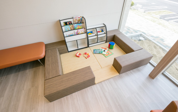 - 小さなお子様も遊んで楽しくお待ちいただけるように、待合室の一角には絵本やおもちゃを揃えたキッズスペースを設けております。待合室から目が届くので、保護者の方もご安心いただけます。